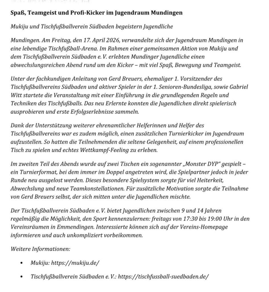 Der MUKIJU holt gemeinsam mit dem Tischfussballverein Südbaden e.V. echtes Profi-Feeling nach Mundingen.